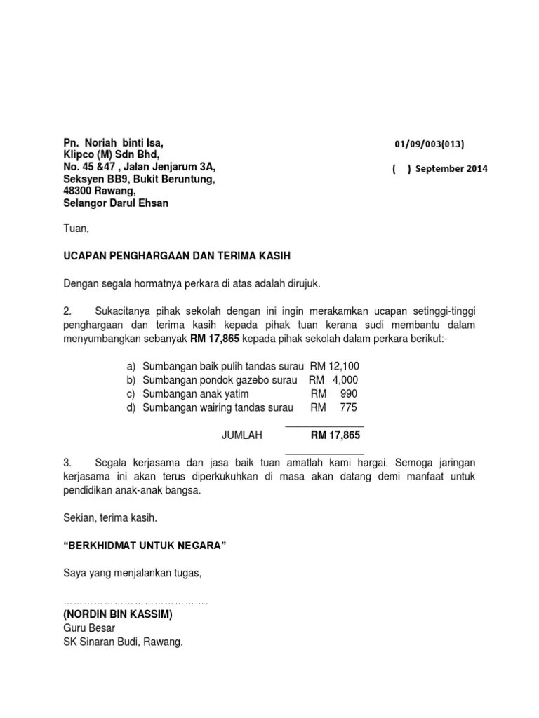 Adalah saya dengan hormatnya merujuk . Penghargaan atas sumbangan tajaan majlis hi tea untuk mengisi tabung pibg smpk vokasional indahpura, kulaijaya, johor. Sumbangan telah kami terima sebesar rp. Sekalung penghargaan dan ucapan terima kasih merujuk . Pihak yang dimaksud dan alamat lengkapnya; No 66 & 66a jalan sri bahari 10050 pulau pinang tuan/puan, penghargaan atas sumbangan t…. Contoh surat ucapan terima kasih atas sumbangan kewangan bagikan contoh. Sumbangan telah kami terima sebesar rp. Penghargaan dan terima kasih kepada pihak tuan atas sumbangan wang tunai. Dalam praktiknya, pengurangan penghasilan bruto dari zakat ini jarang dipergunakan. 4 oktober 2014 kepada :